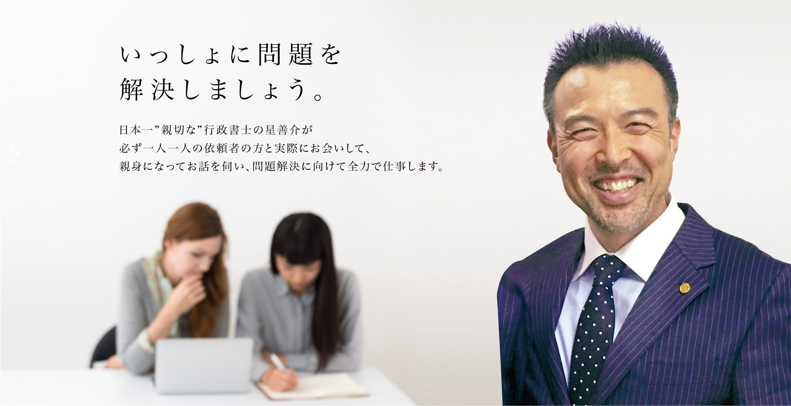 私は、自分の会社を立ち上げて、許認可の必要な仕事を始めるにあたって、インターネットで行政書士を探したんです。ところが、法律に関しては細かいことまで説明されているサイトが多いのですが、私が知りたい比較的基本的な情報が書かれていなかったんです。そこで知り合いに紹介してもらったのが、星さんでした。私の質問に対して、わかりやすい言葉や例え話でシンプルに答えてくれました。最初に会ったときに会社設立から許認可取得、事業開始までの工程を示してくれて、実際予想していたより短期間で、会社の設立から事業開始までもっていくことができました。今でも、頻繁に相談に乗ってもらってます。日本一"親切な"行政書士の看板は偽りではないです。ちょっと褒めすぎかなぁ、星さん(笑)。